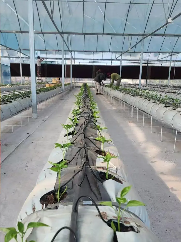 The second greenhouse is primarily used to grow tomatoes and peppers. This greenhouse is equipped with advanced irrigation systems, including an integrated water and fertilizer system, which ensures precise control over nutrient delivery. In just one quarter, the tomato plants produced 20,000 kg of tomatoes, showcasing the effectiveness of the greenhouse setup. Additionally, the photovoltaic system installed on the greenhouse provides clean, renewable energy, further enhancing the sustainability of their operations.