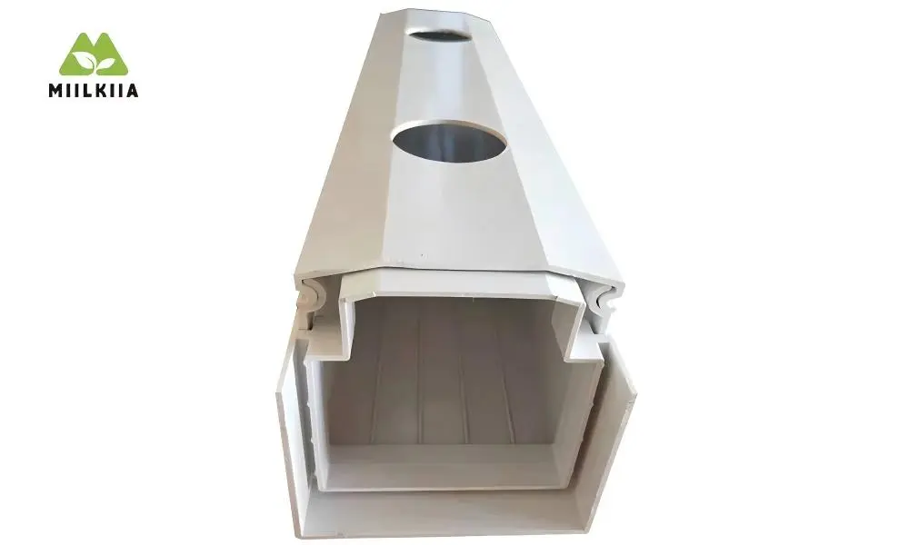 SpecificationsSize: 100×100 mmMaterial: PVC Food GradeColor: WhiteLength: 4 meters (customizable)Hole Size: 50mm (standard, customizable)Best for: Larger crops (Tomatoes, cucumbers), leafy greensOpenable: Available in options (please consult us)